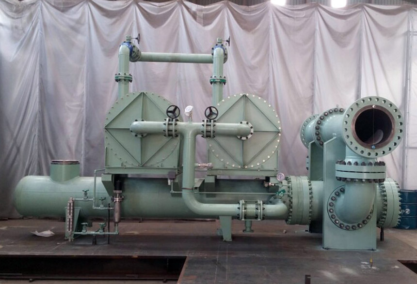 Gland Steam Condenser Packageは、Vacuum PumpとCentrifugal Blowerを通して、Turbine Shaft Sealを集める役割をします。Gland Steam Condenserは、漏れた蒸気と空気の混合物を胴体で空気と蒸気に分離し、凝縮された蒸気は底部に、Drain、空気は上部に排出されます。