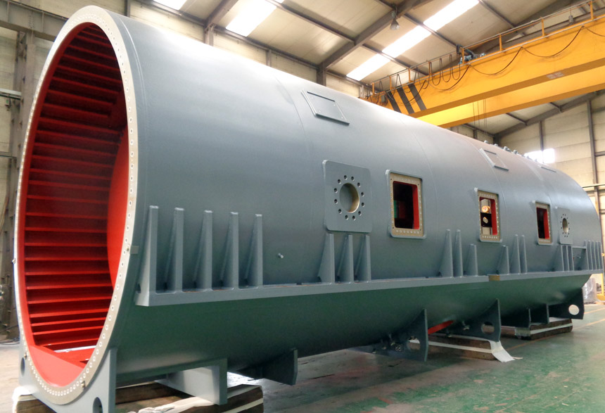 発電機の円筒形シェル(Shell)で、内部には固定子・巻線・放射型リング及びスプリングバーなどが設置され、突然の発電機の負荷変動、3相短絡及び水素ガス爆発に耐えことができる構造で製作する必要があるため、精密な機械加工が要求されます。