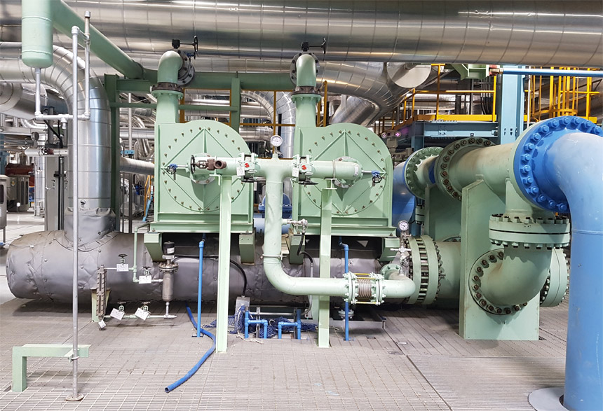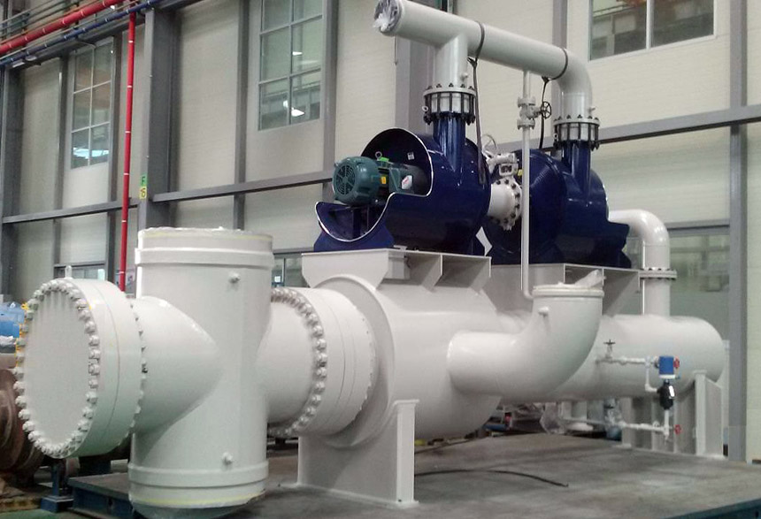 Комплексная установка конденсатора пара уплотнения (КПУ) собирает уплотнение вала турбины с помощью вакуумного насоса и центробежного вентилятора. В корпусе КПУ собранная паровоздушная смесь разделяется на воздух и пар, конденсированный пар выпускается через нижнее отверстие, а воздух – через верхнее.