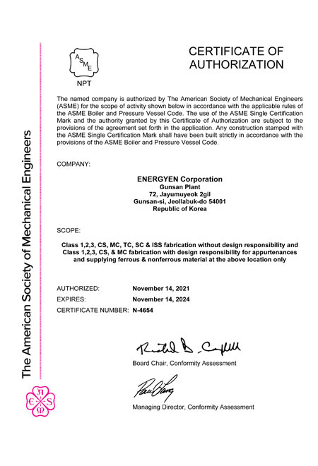 ISO 9001 и 3834-2, ASME STAMPS (U, U2, S, N, N3, NPT), PED и METI.